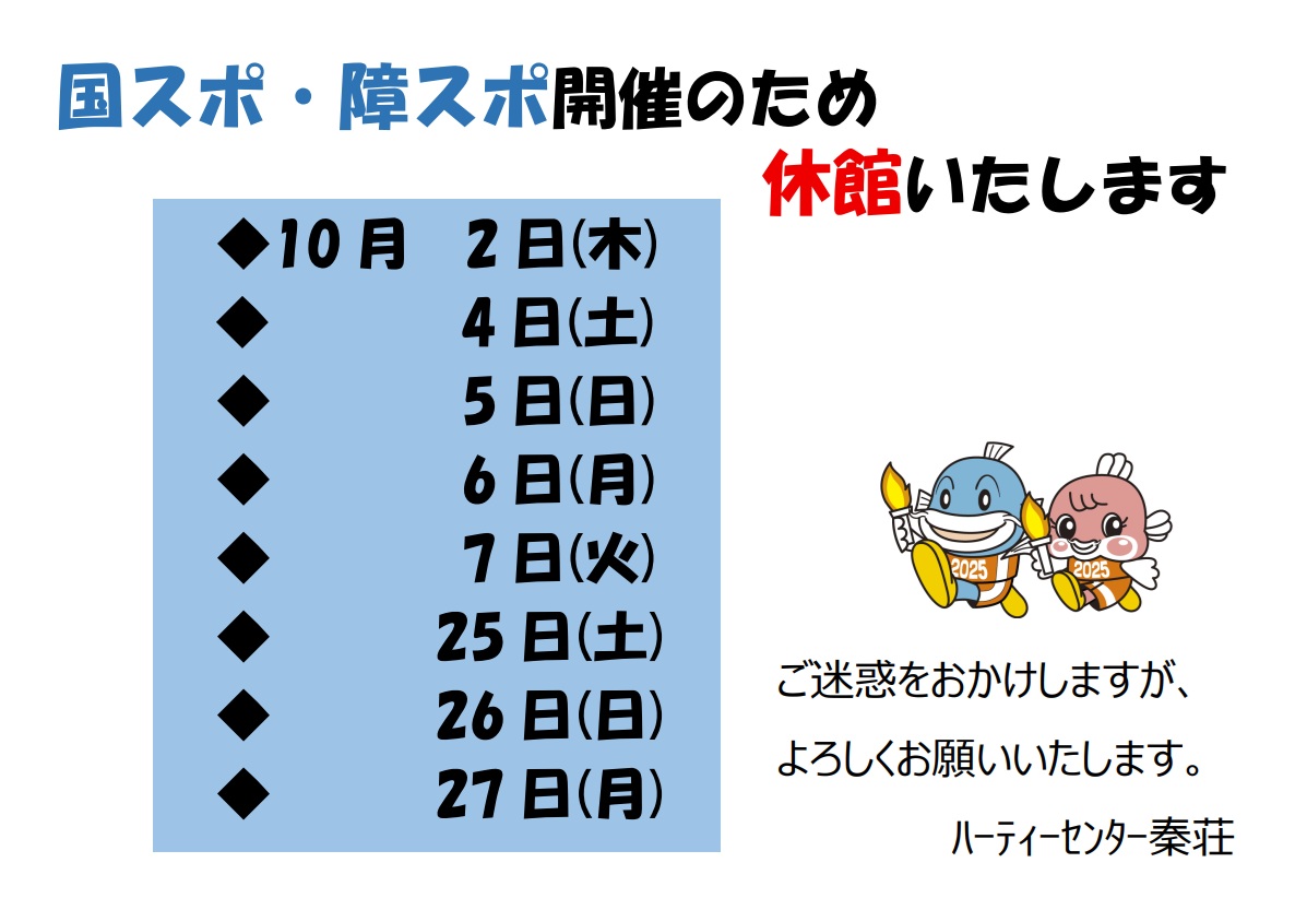 国スポ・障スポ大会開催に伴い、以下日程は臨時休館いたします。
