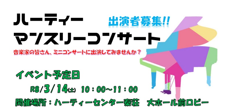 ハーティーセンター秦荘では、下記日程のハーティーマンスリーコンサート出演者を募集しています。